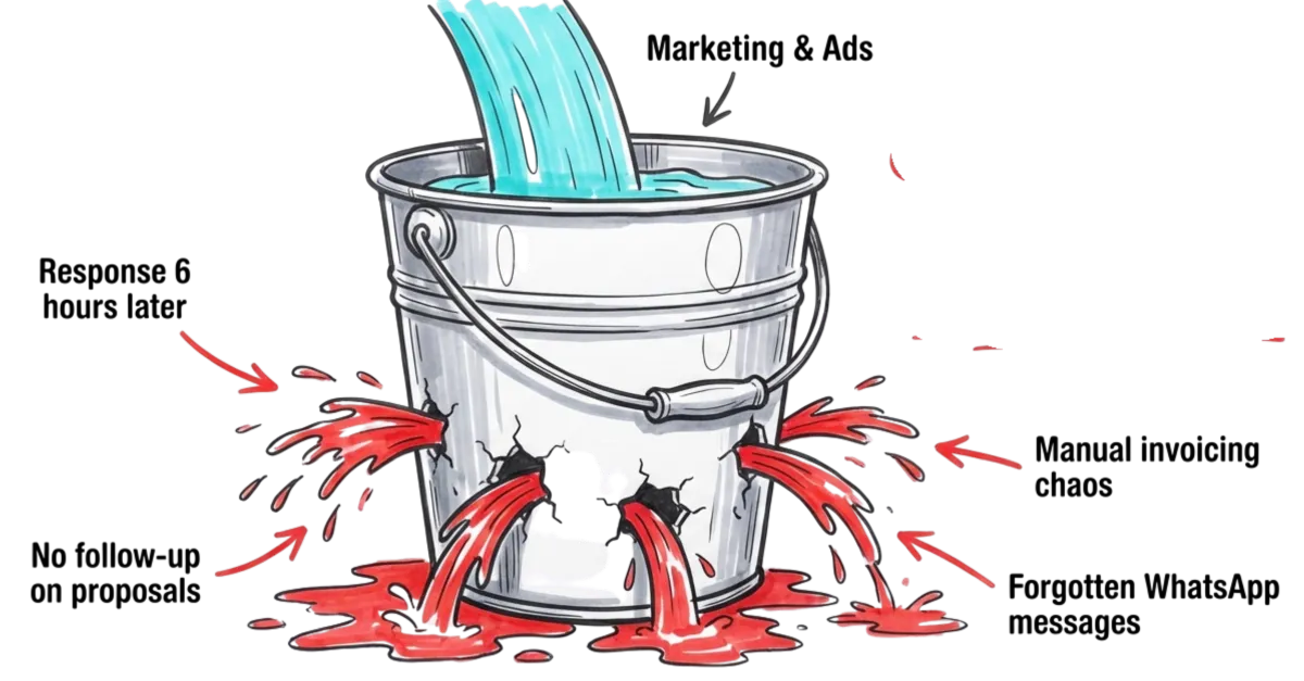 You pour water in the top (your marketing).But the bucket has tiny holes, by the time water reaches the bottom (closed sales), 60% has leaked out through invisible gaps.